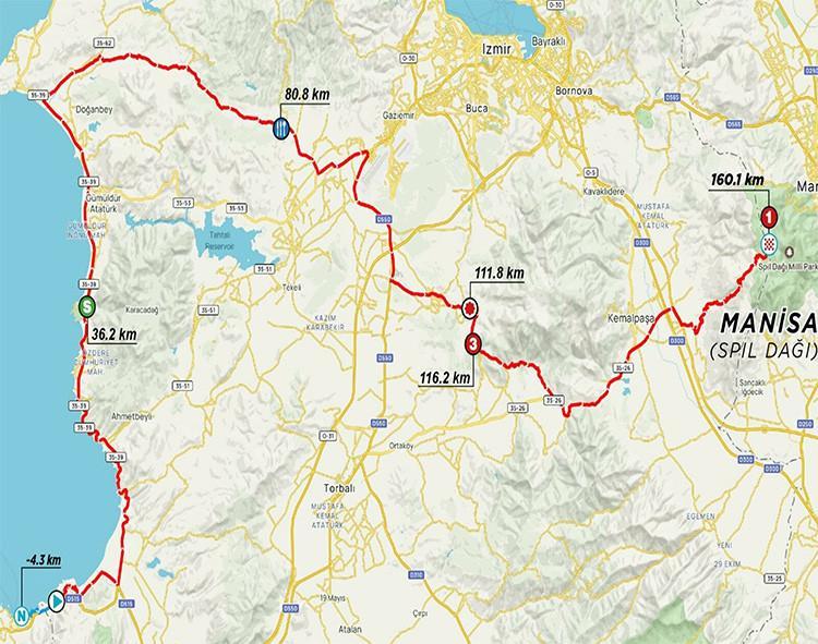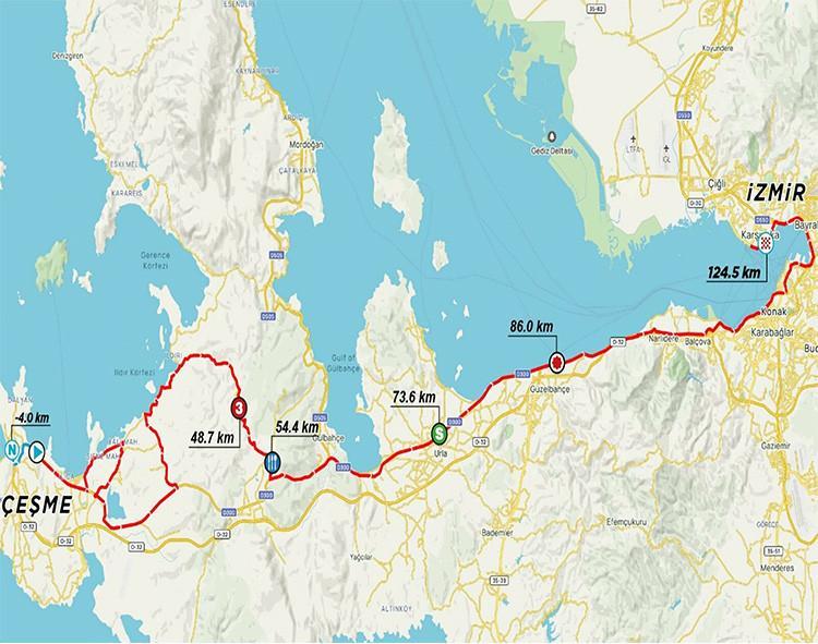 27 NİSAN CUMARTESİ: Çeşme Kalesi önü – 1015 Sk. – 1001 Sk. – 1016 Sk. – 1065 Sk. – 2122 Sk. – Çeşme Asfaltı Cad. – 5193 Sk. – 5152 Sk. – 5232 Sk. – 6000 Sk. – 6329 Sk. – 6001 Sk. – Çeşme Asfaltı Cad. – Ocak Sk. – Germiyan Atatürk Cad. – Germiyan Gazi Mustafa Kemal Cad. – 27033 Sk. – 27000 Sk. – 27062 Sk. – 27095 Sk. – 27000 Sk. – 37220/1 Sk. – Kemal Tuğrul Cad. – 7032 Sk. – 7026 Sk. – Çeşme Yolu Cad. – İçmeler Cad. – Nuri Özbek Cad. – Çeşme Urla İzmir Asfaltı Cad. – Mareşal Fevzi Çakmak Blv. – Mithatpaşa Cad. – Mustafa Kemal Sahil Blv. Çeşme otoyol yan yolu – Mustafa Kemal Sahil Blv. – Fevzipaşa Blv. – Anafartalar Cad. – 9 Eylül Meydanı – Dr. Refik Saydam Blv. – Montrö Meydanı – Şair Eşref Blv. – Atatürk Cad. – Liman Cad. – Altınyol – Anadolu Cad. – Yalı Blv. – Girne Blv. kesişiminden (Yunuslar Kavşağı) geri dönüş – Yalı Blv. Karşıyaka İskele önü bitiş.