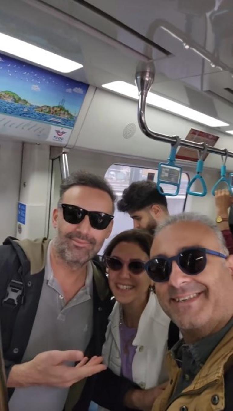 Oyuncu Aycan Koptur ile Rüştü Onur Atilla, bindikleri Marmaray’da meslektaşları Aziz Aslan ile karşılaştılar.